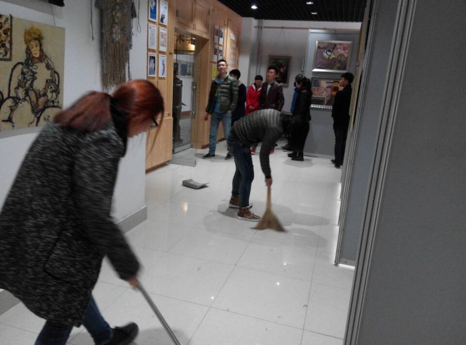 在各班长的带领下,同学们迅速行动起来,以班级组为单位重点对一些卫生死角进行集中清理,同时把老师和员工的艺术作品布置到走廊和办公室,步入美术公司的走廊、办公室墨香阵阵、“画香”宜人,这不仅美化了公司的办公环境,同时也展示了公司师生的专业水平,使美术公司的特色更加浓厚。同学们发挥不怕苦、不怕累的精神,以极大的热情投入到义务劳动中去,布置作品的环节能看出同学们专注的眼神,他们通力合作对每一幅作品的高度认真调试,争取以最佳的姿态展示出来。