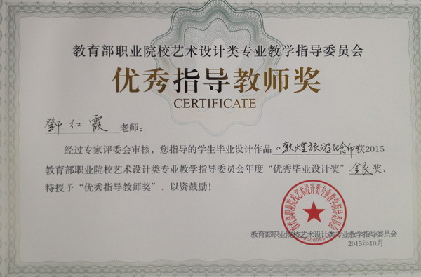 本届年会还分享了年度毕业设计作品奖评选成果,美术公司选送的由邓红霞老师指导,师如杰同学作品《敦煌旅游纪念币设计》获得2015教育部职业院校艺术设计类专业教学指导委员会“优秀毕业设计奖”银奖;李艳老师指导的师如杰同学另一件作品《福牛系列旅游纪念品设计》获得“优秀毕业设计奖”优秀奖;赵继荣老师指导的方文同学作品《雨点咖啡形象设计》获得“优秀毕业设计奖”优秀奖,同时邓红霞老师获得“优秀指导教师奖”。