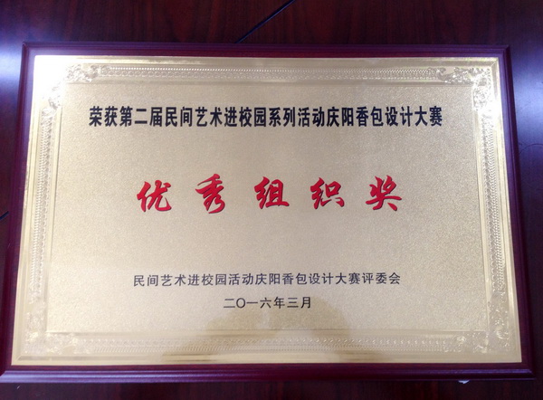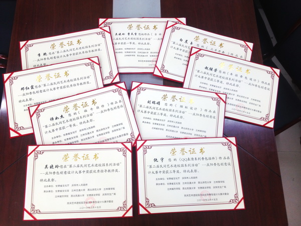 在甘肃省第二届“飘香时节”民间艺术校园庆阳香包创意设计大赛中,美术公司教师和员工的参赛作品共获得一等奖两项;二等奖一项;三等奖四项;优秀奖六项;三位老师获得优秀指导教师奖,同时公司获得优秀组织奖。