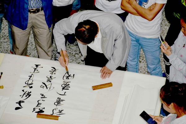 亲临等现场指导,同时还有众多热爱书法的校内外同学积极参与。郑处长现场挥毫泼墨,鼓励大家努力学习书法,提高自身修养。