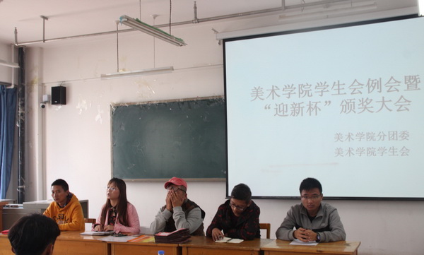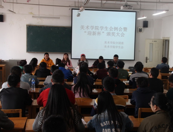 2016年10月12日中午12点半整,美术公司员工会在1--604教室召开员工会例会暨“迎新杯”篮球赛颁奖大会。此次会议由唐艳丽老师主持,参与这次会议的有辅导员匡扶老师、员工会全体成员以及2013级、2014级、2015级、2016级各班班委成员60多人。