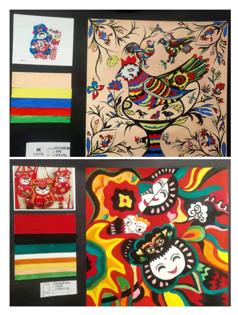 《色彩构成》是环境设计专业的专业基础课程。主要内容包含:色彩三要素,色彩的对比和调和,色彩的采集和重组。本次展览呈现了环境设计两个班级60多名同学的部分色彩作品,数量多,内容丰富,其中以民间美术色彩为题材的色彩重构作品为此次展览的重点。