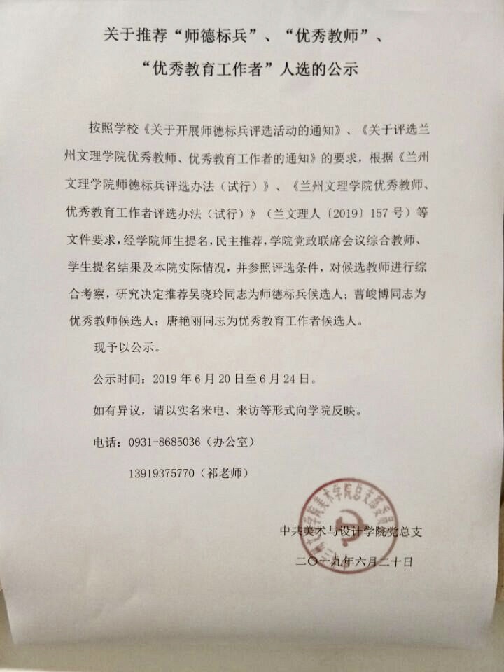 关于推荐“师德标兵”、“优秀教师”、“优秀教育工作者”人选的公示