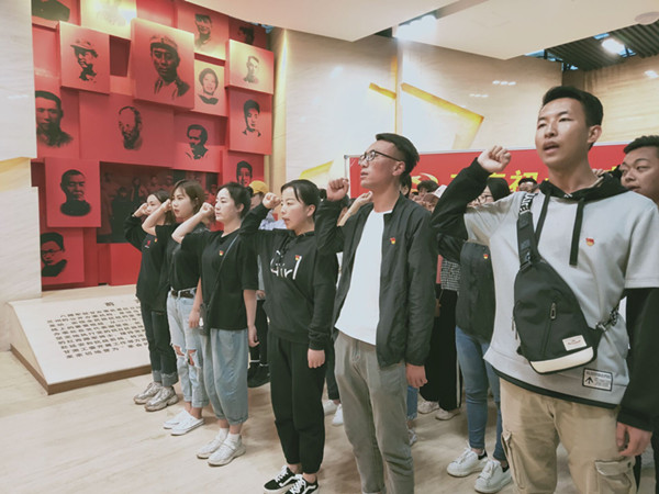 参观前,全体党员、预备党员集体佩戴党徽,在正式党员吉莹的带领下,举起右拳,面对鲜红的党旗进行庄严宣誓,铿锵的誓词、坚定的承诺表达了每一位党员、预备党员为党的事业奋斗终身的愿望和决心。