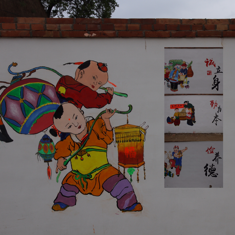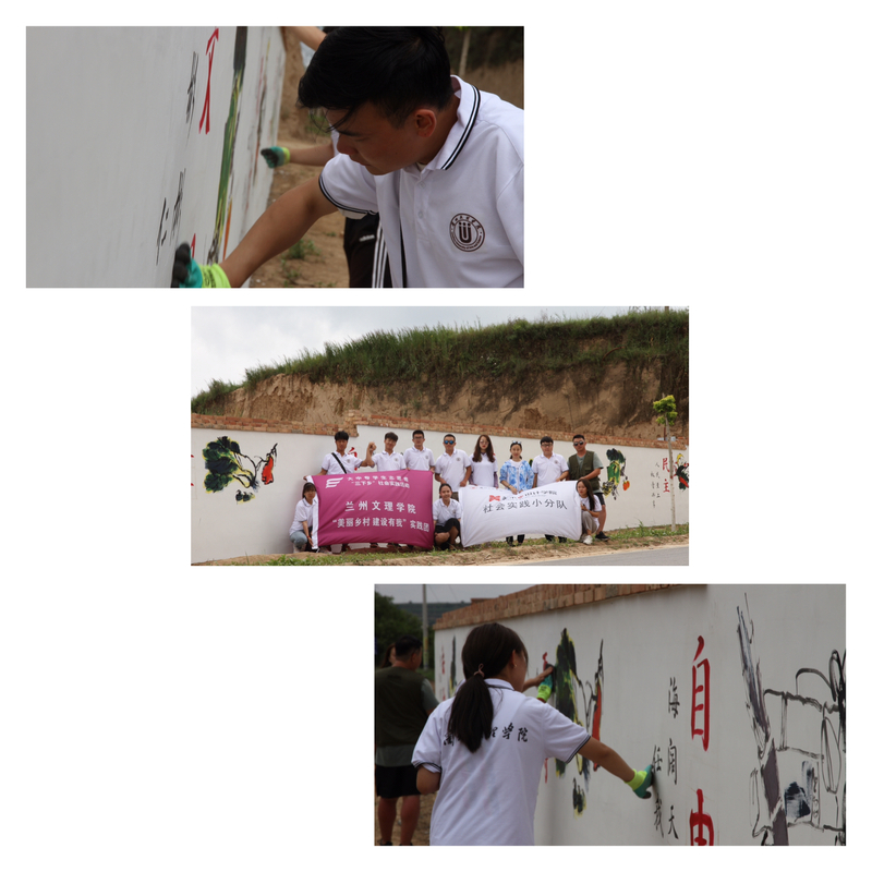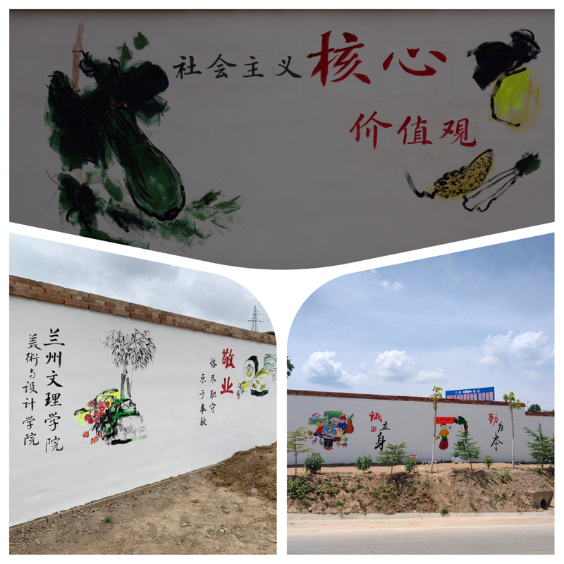 燃动青春,艺绘乡村。受乡镇委托在309国道沿线绘制中国梦主题和社会主义核心价值观主题乡村景观文化墙近300米,共25幅画卷,一幅幅生动美丽的画卷蜿蜒在国道沿线,既弘扬主旋律,又体现当地民俗民风,美化乡村风貌。通过艺术的力量为脱贫攻坚和乡村振兴添砖加瓦。