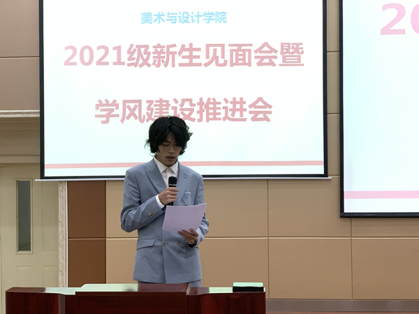 2020级环境设计2班员工朱昇2021级戏剧影视美术设计班员工徐雅蓉分别代表在校生和新生发言。朱昇鳌介绍了自己在公司学习和生活方面情况,分享了作为班干部的成长感悟,新生表达了对老员工活的美好憧憬和作为新时代青年不懈奋斗的坚定信念