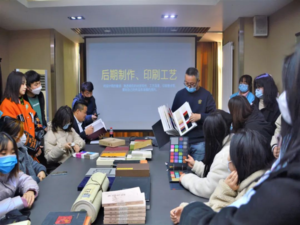 培训期间,大雅文化公司的员工将多年积累经验、专业及艺术感悟分享给同学们。业务部经理杨得宏就印刷方面的印刷常识、工艺、误区为同学们进行了讲解;经理马德军为同学们带来了以“一本书的诞生”为主题的系列课程培训,课程培训精彩、幽默、风趣,赢得了同学们的一致好评;调色师梁剑鸣就“图像处理对印刷品的重要性”进行实例分析和详细讲解,并分享了自己职场上的工作经验。最后,同学们翻阅国际获奖书籍、国内高端书籍作品,参观公司先进专业色彩管理系统和硬件设备,期间就印刷新工艺技术和材料与设计人员进行交流互动。