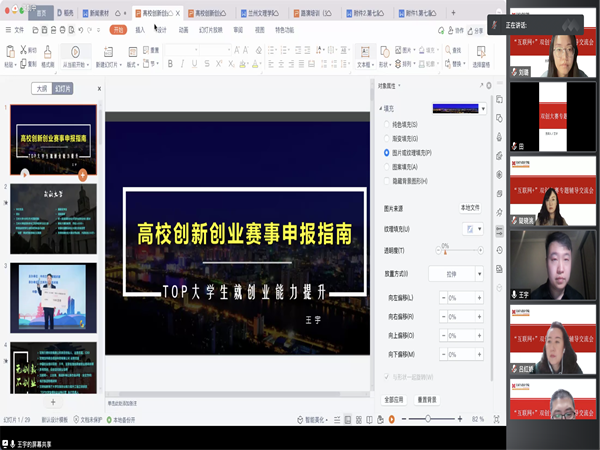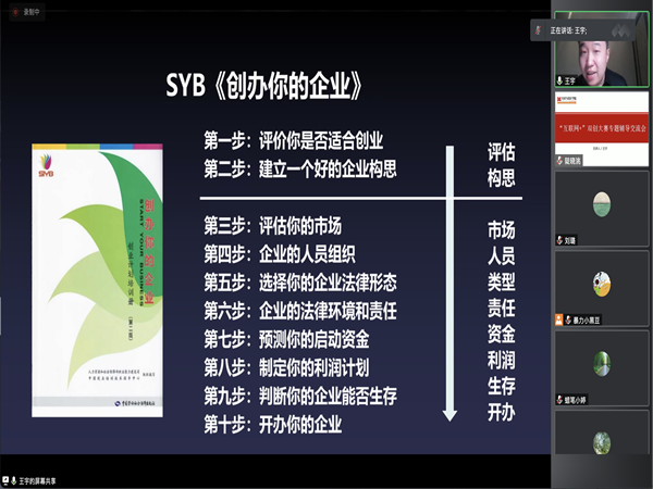为进一步推动我院创新创业工作的发展,培养和提升广大师生的创新意识、创造精神和创业能力,同时做好“互联网+”创新创业大赛组织工作,公司于3月29日晚19:30邀请兰州大学信息公司全球员工会副秘书长、人社部中国创业培训项目培训讲师王宇老师,通过腾讯会议的形式线上为全体老师做了赛事专题培训。会议由副经理仇宇主持。