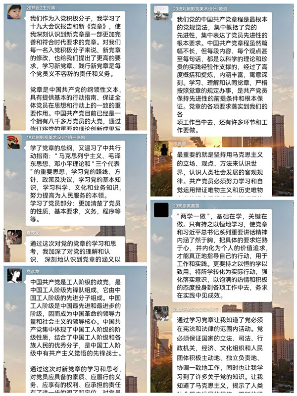 原垚、黄嘉露、夏双龙、何婉宁、党彦龙、张凯、王兴涛、王桠民等同学依次向大家分享了自己的学习心得,并且进行了自我剖析,表示非常珍惜这次来之不易的学习机会。在学习党章党史中坚定理想信念,提高思想觉悟,强化服务意识,理论联系实际,做到学以致用,自觉接受党组织的考验。
