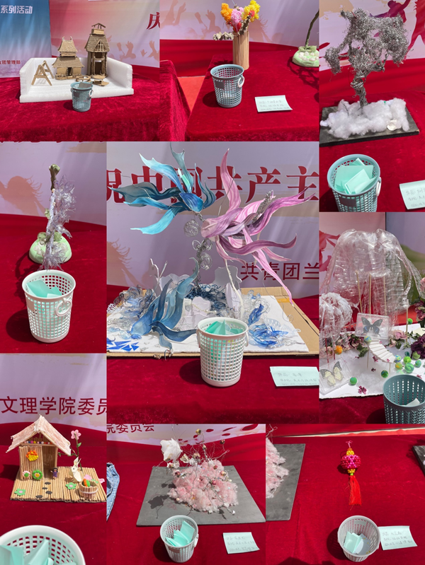 “物尽其用 绿色生活”大赛是为了开展同学们对“环保”的了解,增加同学们的动手能力,激发同学们的环保意识,在认识环境的情况下,也能知道资源的可重复利用性。我们将生活中、学习上废弃的易拉罐、矿泉水瓶,可乐瓶或没用的废弃文具、办公用品、玩具,甚至是废螺丝铁条等等一切所谓的“垃圾”,通过同学们大胆构思想象、用心设计,制作出最奇妙、美丽的工艺品。