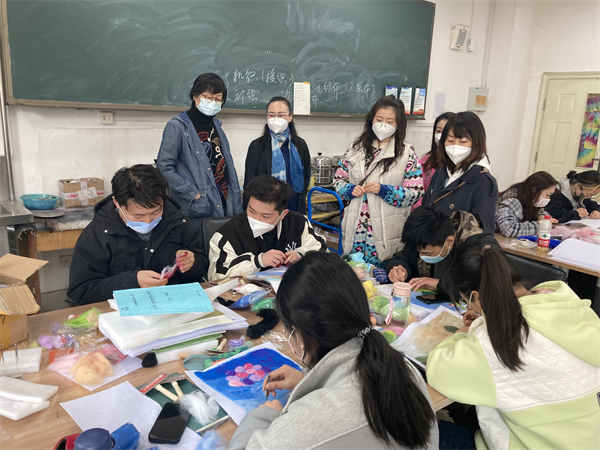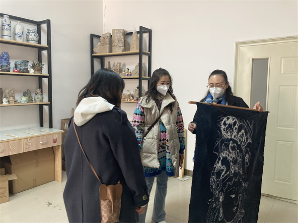 最后,老师们观摹了温晓晖老师的羊毛擀毡课程,并与温老师和正在上课的同学们进行了讨论与交流,进一步深入了解了我们的专业优势、特色教学方式计划来公司就羊毛擀毡、扎染等课程进修学习。