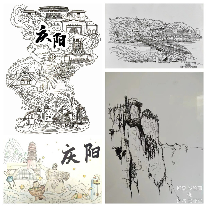 (图片为22环境设计专业王子怡、李卫娟作品《庆阳印象》,22环境设计专业柳兴阳作品《属于兰州人的回忆》,22绘画班张亚军作品《陇南陈县鸡峰山》)