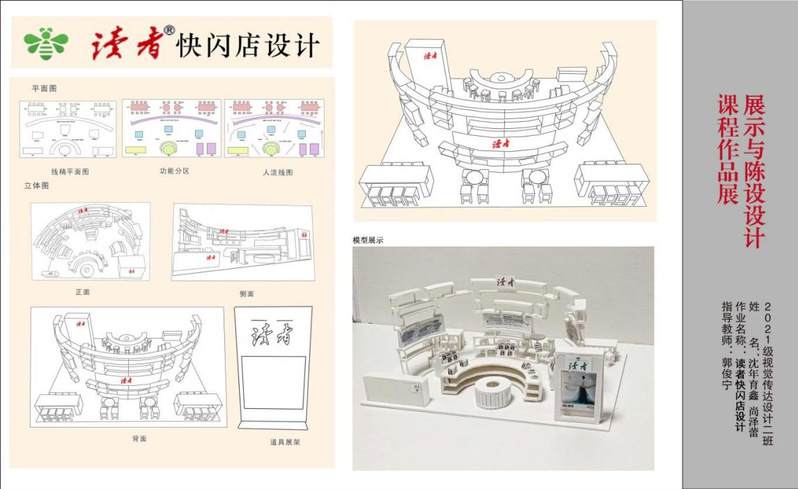《展示与陈设设计》课程是视觉传达设计专业的一门核心专业课。课程重点学习了展陈设计的内容活动策划,展陈中的空间、道具、橱窗、灯光设计,以及展陈的模型制作等。在课程实践阶段,同学们实地调研了优秀展陈设计案例,并通过分析、临摹这些案例加深对理论知识的理解。在此基础上,以甘肃地方特色品牌的商业展陈设计为项目进行策划与创作,内容包括品牌展示的空间规划、平面布局、色彩设计、道具设计,模型制作等。