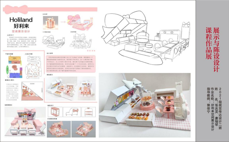 《展示与陈设设计》课程是视觉传达设计专业的一门核心专业课。课程重点学习了展陈设计的内容活动策划,展陈中的空间、道具、橱窗、灯光设计,以及展陈的模型制作等。在课程实践阶段,同学们实地调研了优秀展陈设计案例,并通过分析、临摹这些案例加深对理论知识的理解。在此基础上,以甘肃地方特色品牌的商业展陈设计为项目进行策划与创作,内容包括品牌展示的空间规划、平面布局、色彩设计、道具设计,模型制作等。