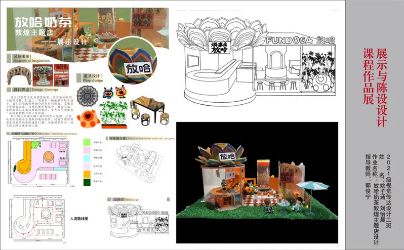 《展示与陈设设计》课程是视觉传达设计专业的一门核心专业课。课程重点学习了展陈设计的内容活动策划,展陈中的空间、道具、橱窗、灯光设计,以及展陈的模型制作等。在课程实践阶段,同学们实地调研了优秀展陈设计案例,并通过分析、临摹这些案例加深对理论知识的理解。在此基础上,以甘肃地方特色品牌的商业展陈设计为项目进行策划与创作,内容包括品牌展示的空间规划、平面布局、色彩设计、道具设计,模型制作等。