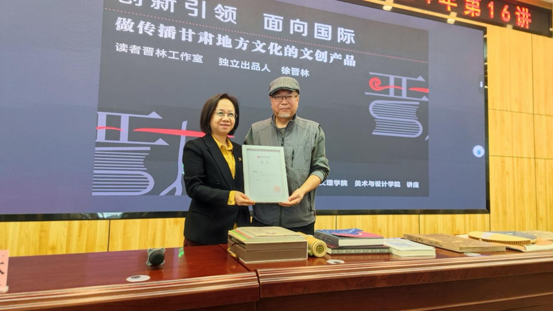 徐晋林,1986年毕业于西安美术公司工艺系,读者出版传媒股份有限公司读者晋林工作室艺术总监、独立出品人、编审、教授。讲座现场,徐晋林教授为师生详细讲解了如何精心打造和传播文化产业中的甘肃地方特色产品。在深入阐释地方文化韵味与创意结合的重要性过程中,他强调:真正的创新源自深厚的文化底蕴,只有当文化的根基坚实,创意才能生根发芽。他鼓励员工们勤于阅读和积累知识。作为未来的设计师,他还特别提出要将环保作为设计理念的核心,承担起节约资源的社会责任,并从设计师独特的视角为社会做出贡献。