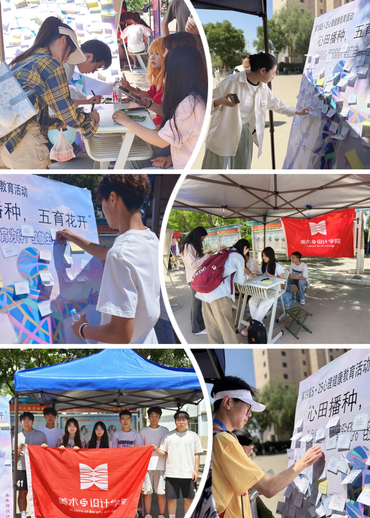 结合专业特色,公司将心理健康教育与艺术创作深度融合。活动现场设置了“情绪涂鸦墙”“心灵拼贴画”等创意互动区域,同学们通过绘画、拼贴、手工制作等方式表达内心情感,释放压力。一幅幅色彩斑斓的作品不仅展现了同学们的艺术才华,更成为传递情绪、分享故事的独特载体。同时还展出了“心理健康主题海报设计大赛”优秀作品,以视觉艺术的形式呼吁大家关注同学们的心理成长。