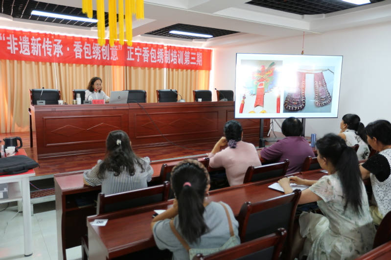 在推动中华优秀传统文化创造性转化、创新性发展的背景下,为进一步加强校地合作,促进非物质文化遗产的保护与传承,同时提升地方非遗产业的市场竞争力,8月19日-8月20日,伟德国际victor1946经理吴晓玲教授应邀为正宁县文化馆举办的第三期“非遗新传承·香包绣创意”培训活动进行授课指导,这期指导是以讲座的形式呈现,专题讲座从“形、色、质、意、趣”深入浅出地讲解了香包产品造型的重要性、造型配色技巧以及如何利用现代科技手段促进非遗文化的传播与创新。讲座内容丰富,既有理论深度,又具实践指导意义,在互动和交流中非遗传承人和学员们纷纷表示,系统的学习造型艺术对非遗产品创新更具有指导意义,让大家受益匪浅。